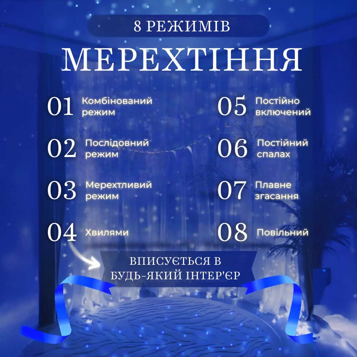 Гірлянда штора 2х2 м 240 LED світлодіодна мідний провід 8 ниток Синій ZWM2240LEDBL