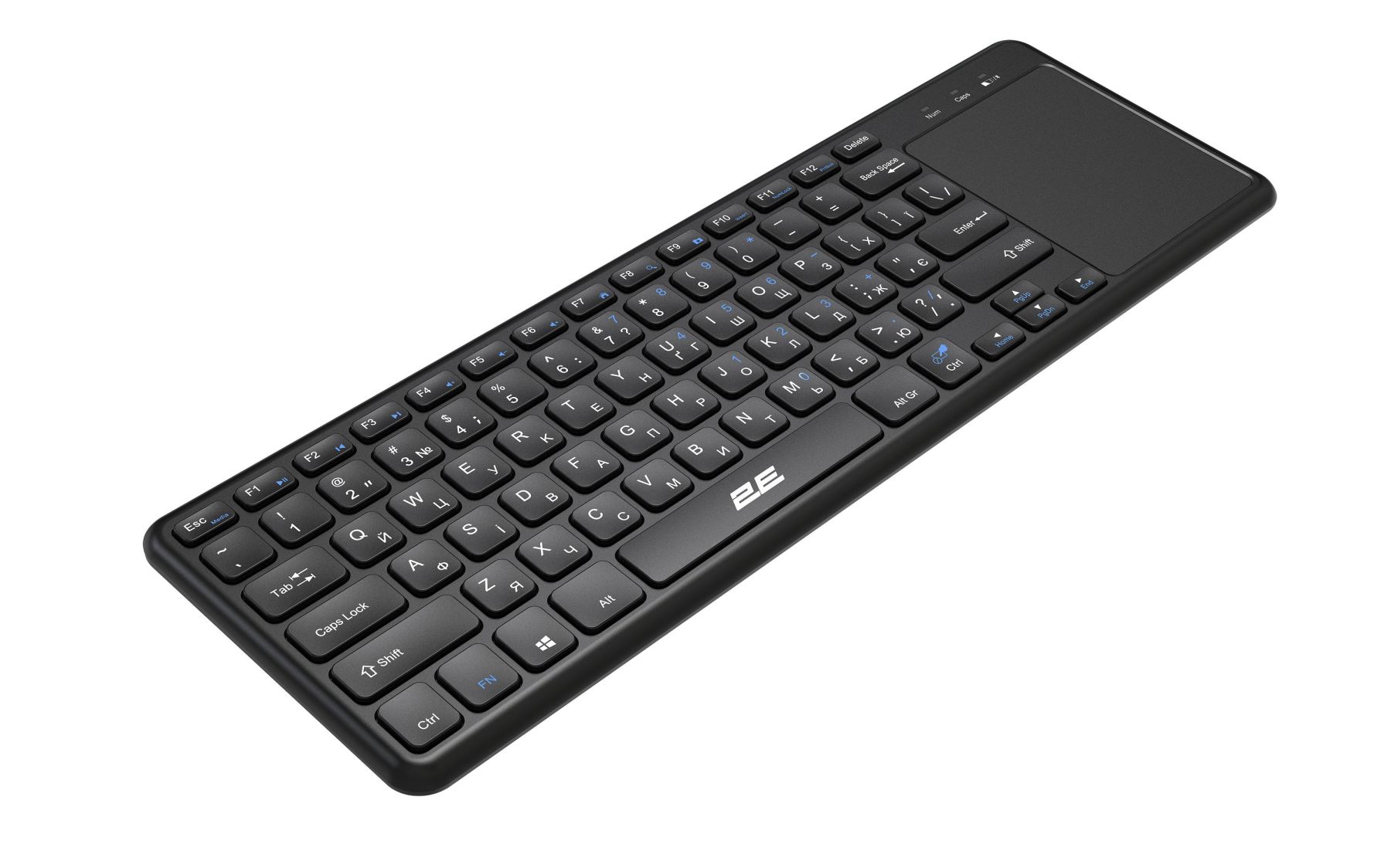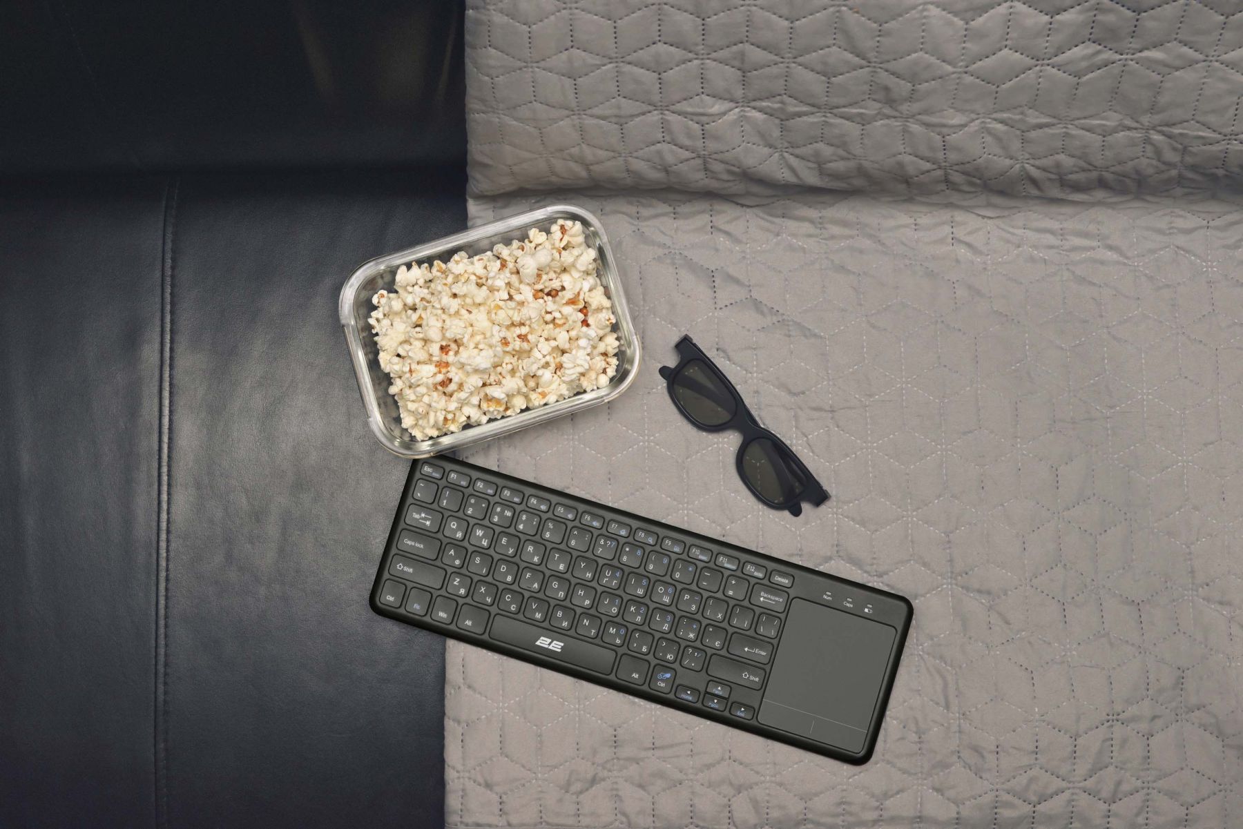 2E KT100 розроблено спеціально для зручної роботи. З її допомогою можна замінити відразу два пристрої і працювати в зручному для себе місці. Підтримуються різні ОС, в тому числі і SmartTV, тому один з сценаріїв передбачає роботу з телевізором прямо на дивані. Клавіатура виконана з чорного полікарбонату з матовою поверхнею. Тачпад отримав приємне покриття, завдяки якому палець відмінно ковзає по поверхні. Вся лінійка клавіатур 2Е має пріоритетну українську розкладку.
