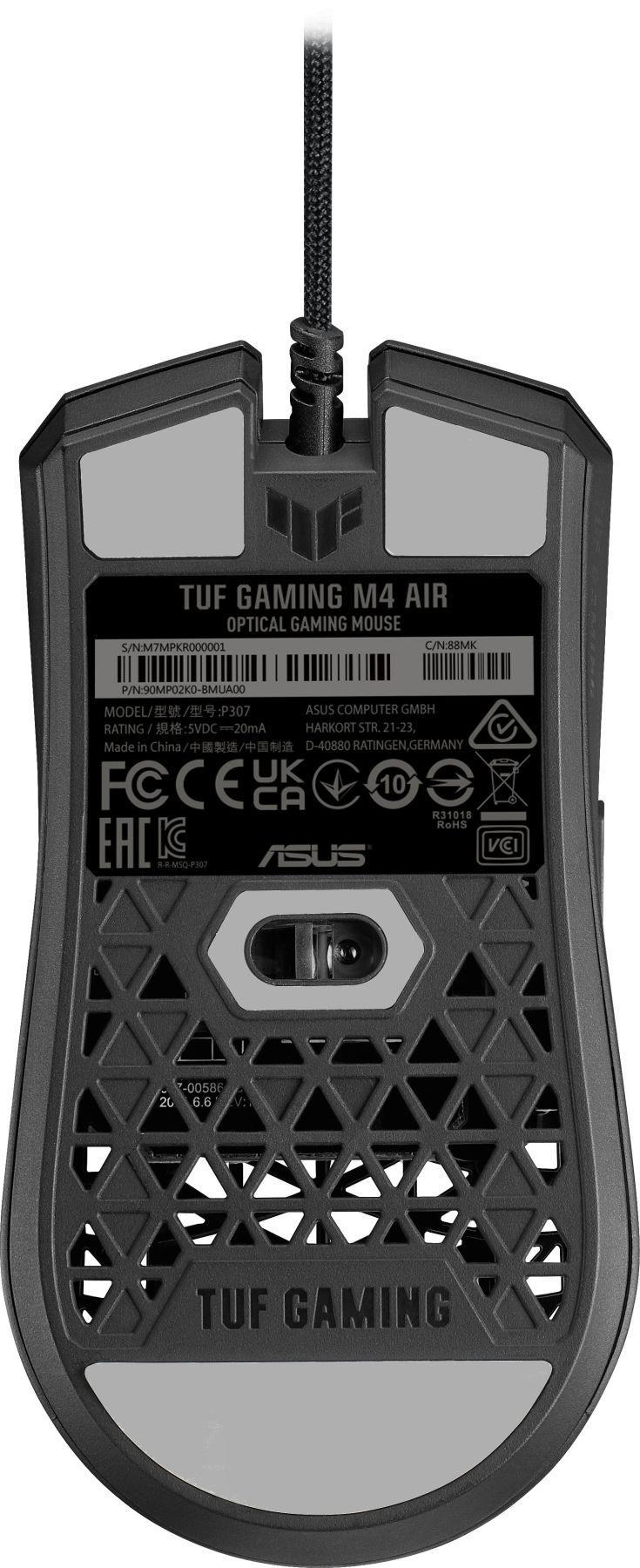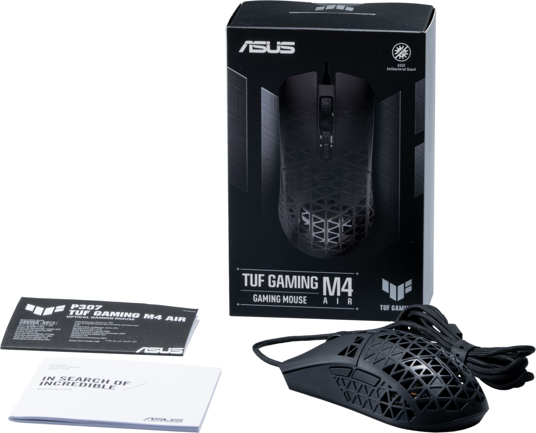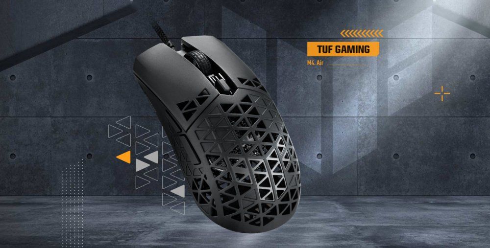 TUF Gaming M4 Air – це ультралегка провідна ігрова миша, оснащена високоточним оптичним сенсором з роздільною здатністю 16 000 пікселів/дюйм. Її легко персоналізувати на свій смак, запрограмувавши шість наявних кнопок. Установки пристрою зберігаються у трьох профілях у власній внутрішній пам'яті. Дана модель важить всього 47 грамів, але має досить міцну конструкцію. Для забезпечення легкого та плавного ковзання вона забезпечена гнучким кабелем Paracord та тефлоновими ніжками. Крім того, це гігієнічний пристрій, адже його поверхні оброблені спеціальним антибактеріальним покриттям ASUS.