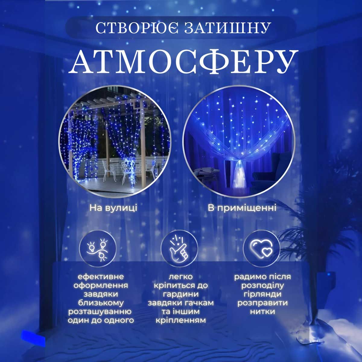 Гірлянда штора 2х2 м 240 LED світлодіодна мідний провід 8 ниток Синій ZWM2240LEDBL
