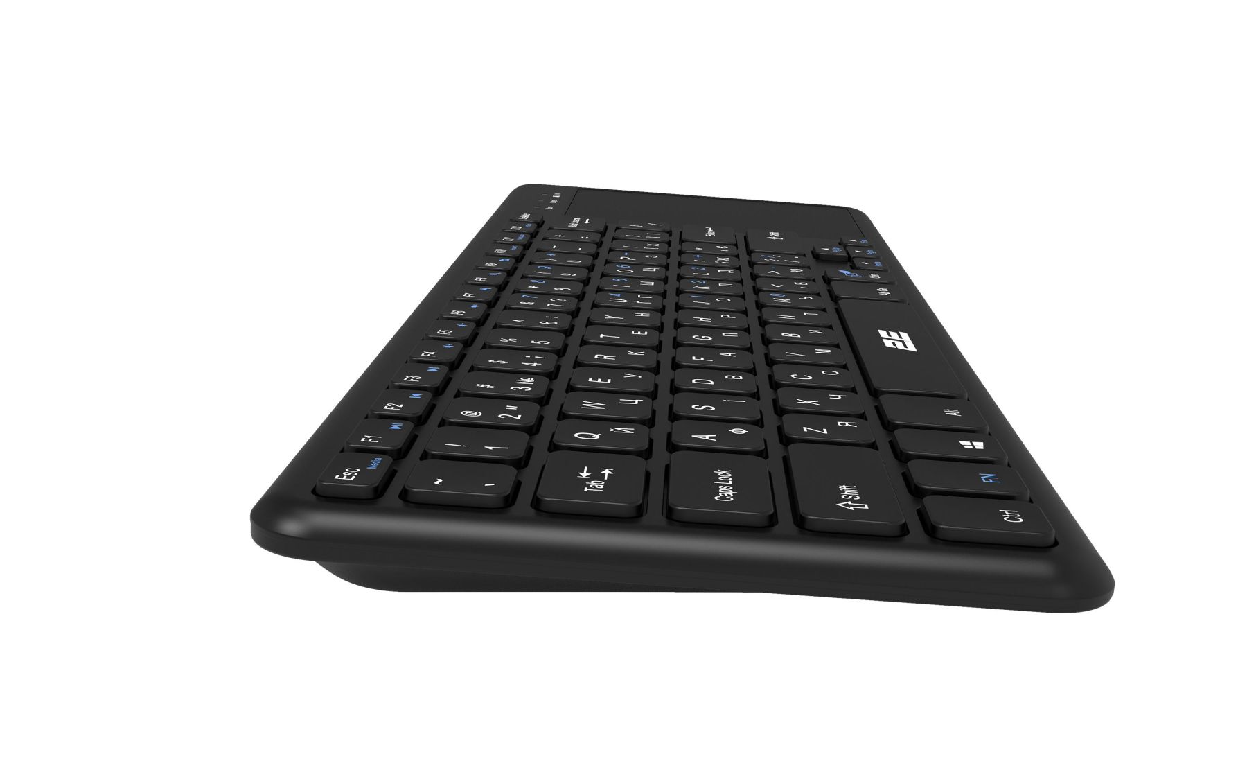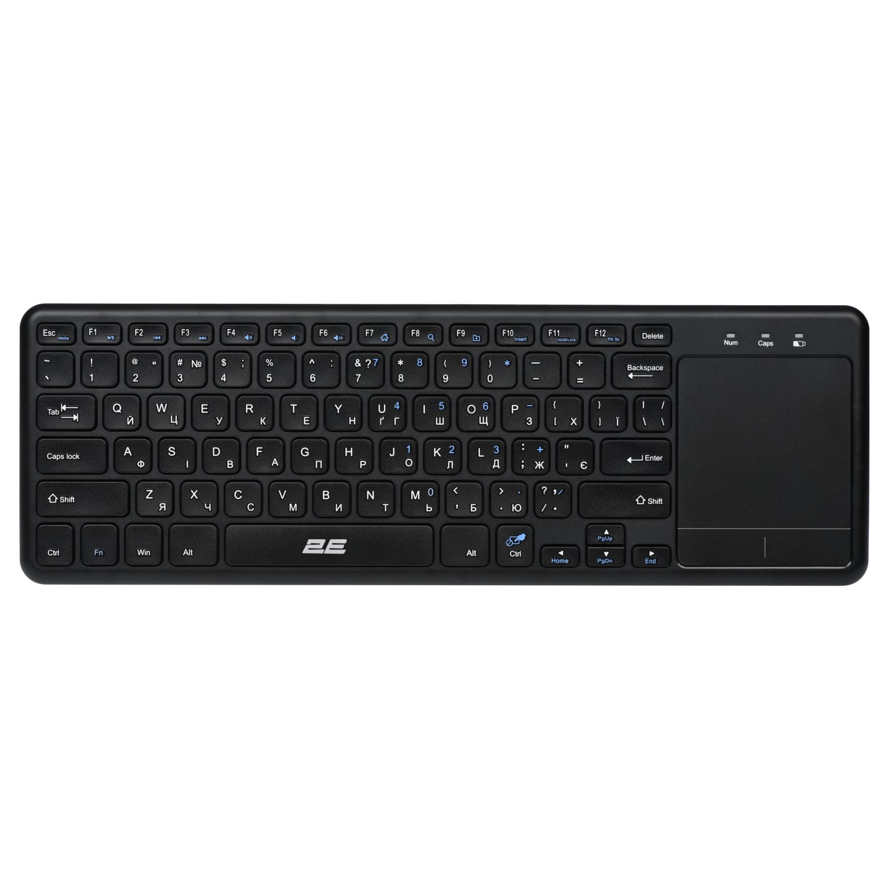 2E KT100 розроблено спеціально для зручної роботи. З її допомогою можна замінити відразу два пристрої і працювати в зручному для себе місці. Підтримуються різні ОС, в тому числі і SmartTV, тому один з сценаріїв передбачає роботу з телевізором прямо на дивані. Клавіатура виконана з чорного полікарбонату з матовою поверхнею. Тачпад отримав приємне покриття, завдяки якому палець відмінно ковзає по поверхні. Вся лінійка клавіатур 2Е має пріоритетну українську розкладку.