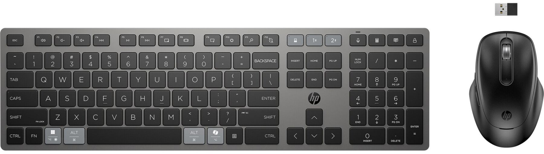 Комплектація:гарантійний талон, короткий посібник із початку роботи, кабель USB Type-C, адаптер HP Unifying Dongle, бездротова клавіатура, бездротова миша
