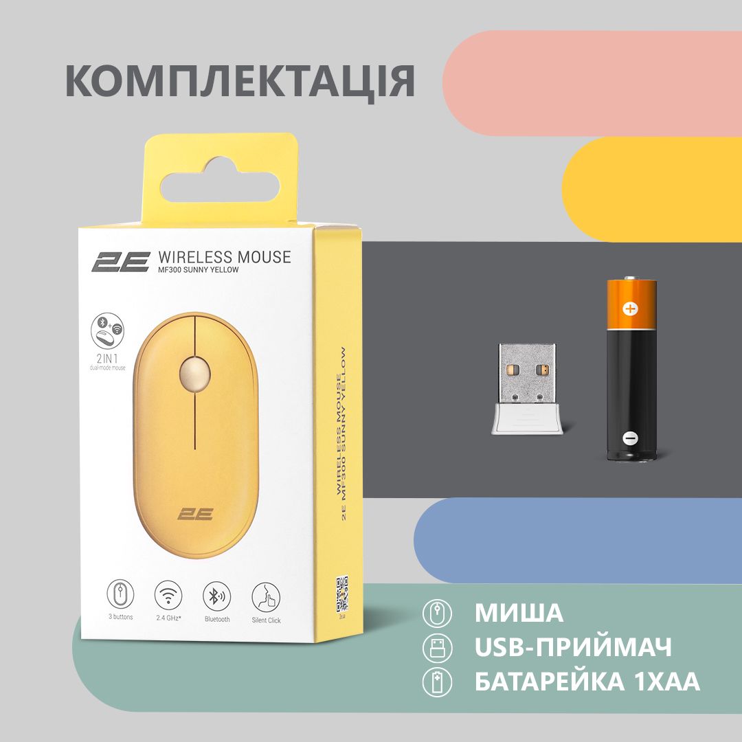 Миша 2E MF300 Silent, WL/BT, жовтий
